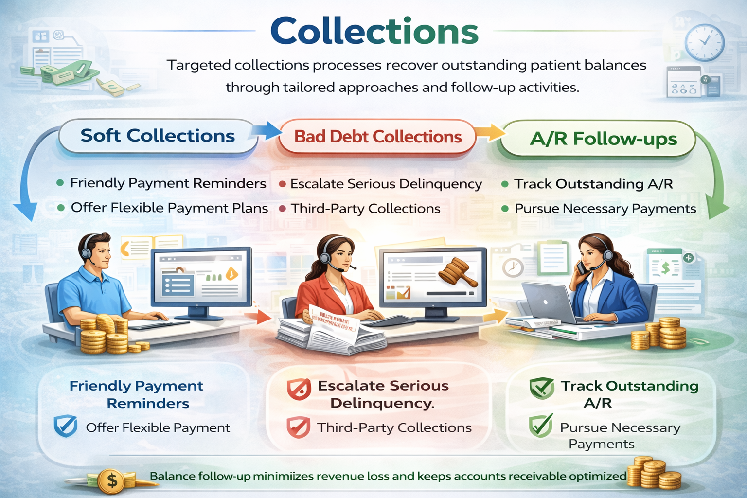 Soft Collections focus on early-stage patient balances through friendly reminders, statements, and flexible payment options. This approach encourages timely payments, improves patient experience, and reduces escalation to advanced collection stages.