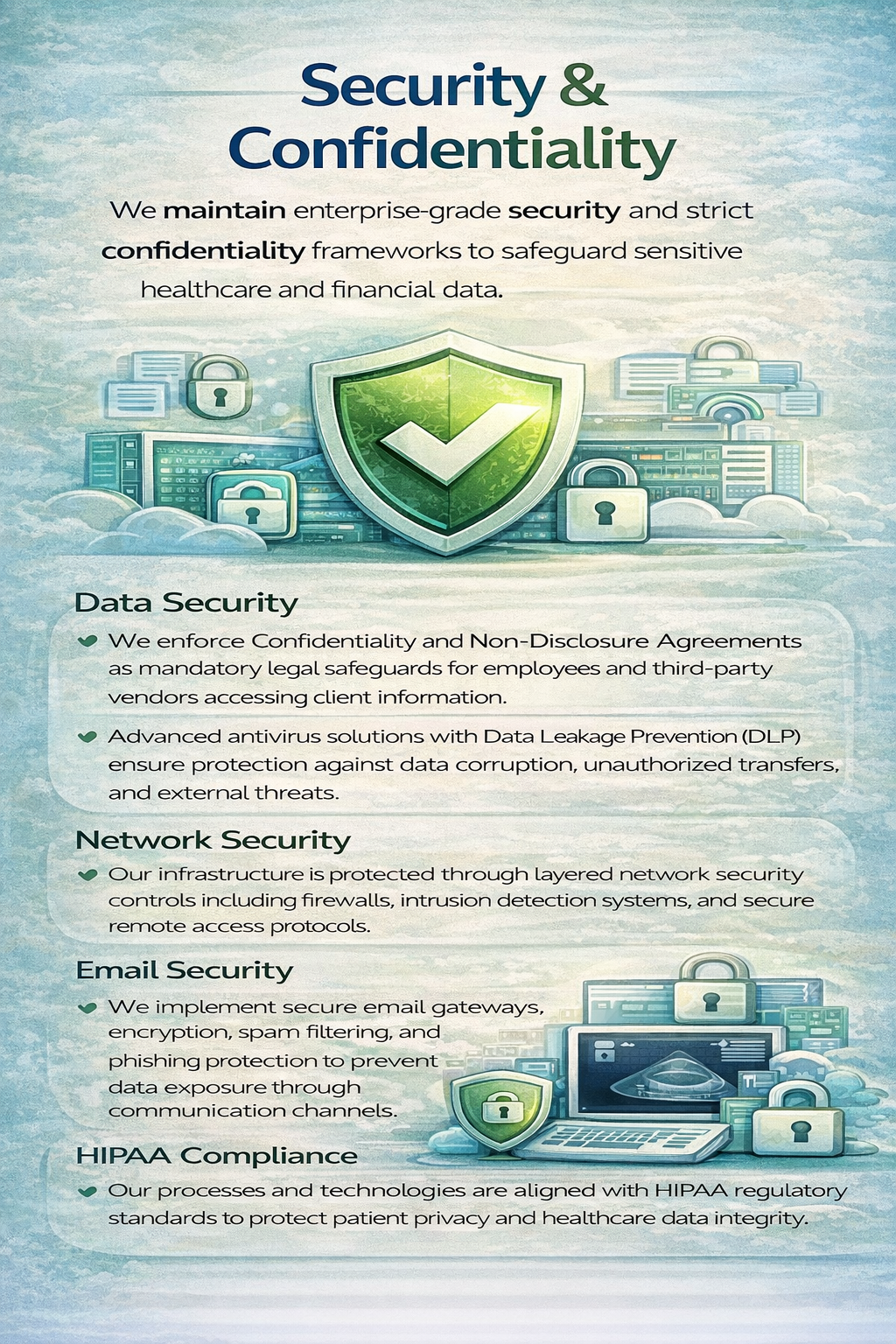 We maintain enterprise-grade security and strict confidentiality frameworks to safeguard sensitive healthcare and financial data.